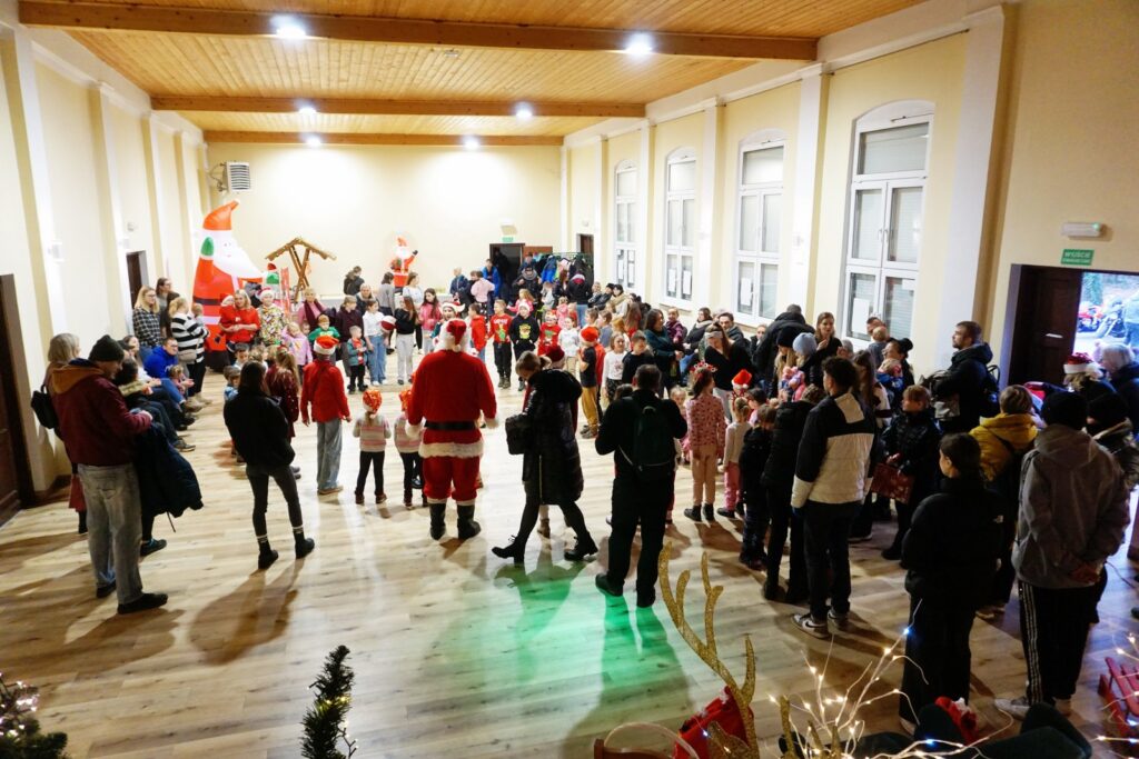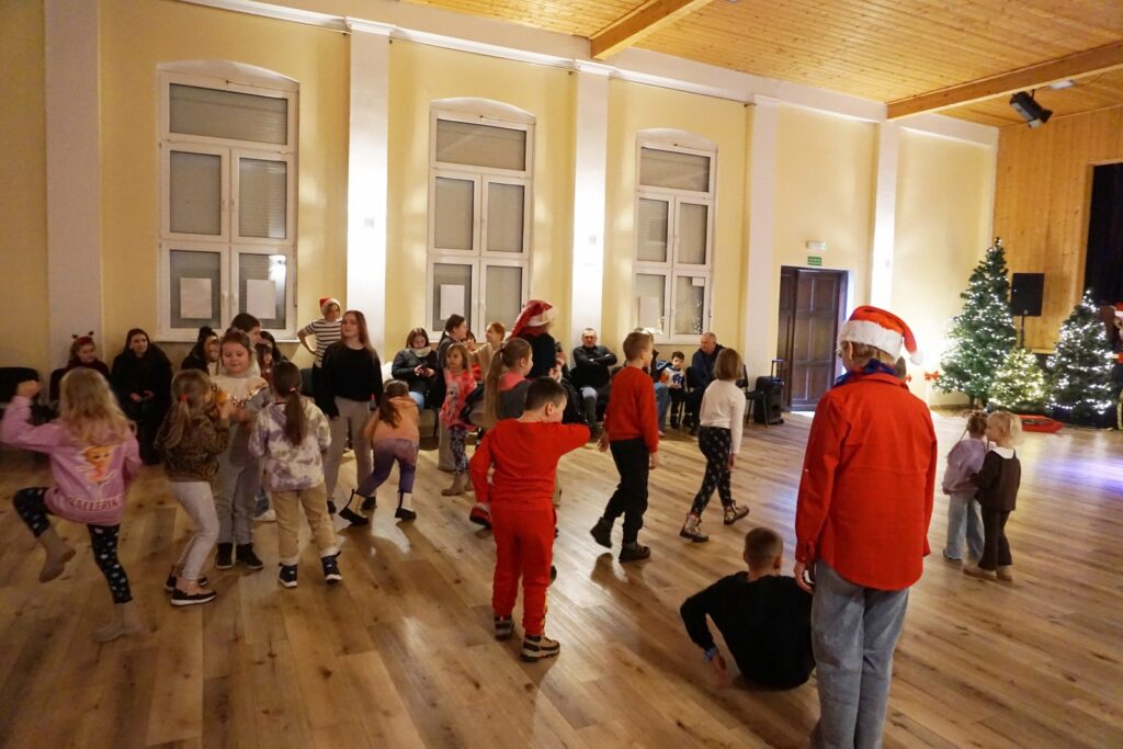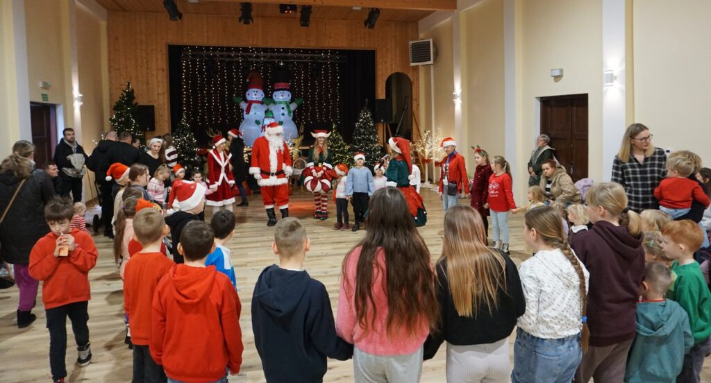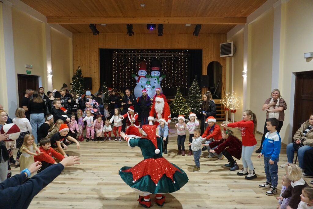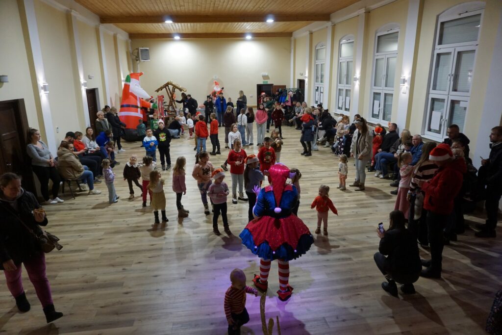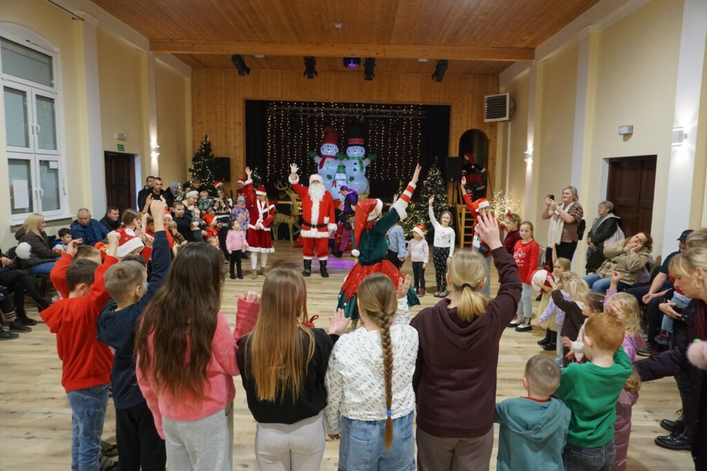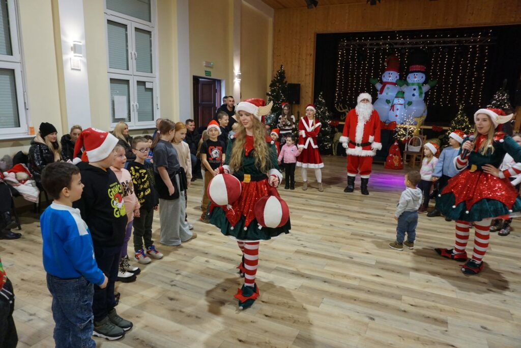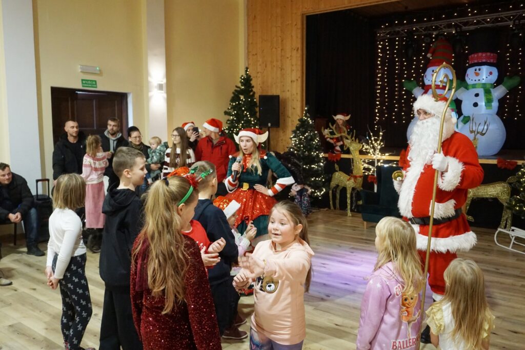 Elementem dekoracyjnym były pięknie udekorowane choinki z migoczącymi iluminacjami, którym towarzyszyły świecące renifery. Dzieciaki mogły podziwiać olbrzymie dmuchańce: wesołą rodzinę bałwanów oraz imponującego, wielkiego Mikołaja. Uśmiechnięte Elfy z Malinowej Chatki poprowadziły animacje, angażując dzieci do wspólnych zabaw i tańców. Kulminacyjnym punktem programu było wejście Specjalnego Gościa i zabawy ze Świętym Mikołajem, który w wolnej chwili chętnie pozował do zdjęć. Słodkie przysmaki zaspokajały apetyty małych gości. Na stołach czekały liczne słodycze, w tym różnorodne ciastka, cukierki i soczki… W budynku pachniało watą cukrową i bąbelkowymi goframi. Serwowały je niezawodne członkinie Koła Gospodyń Wiejskich „Jezioranki”. Był to ich dar serca. Dzieci nie wychodziły z sali z pustymi rękami! Uczestnicy otrzymywali upominki rzeczowe z mikołajowych worków, ufundowane przez Stowarzyszenie „Aktywni”, z dofinansowania ze Starostwa Powiatowego. Następnie zabawa przeniosła się na zewnątrz.