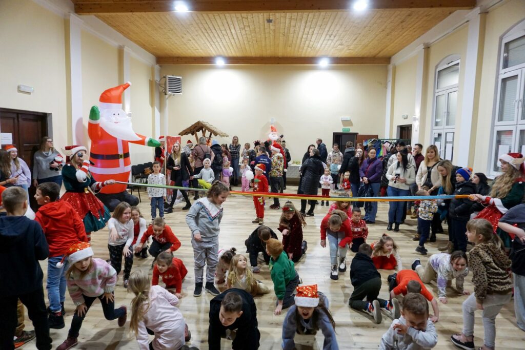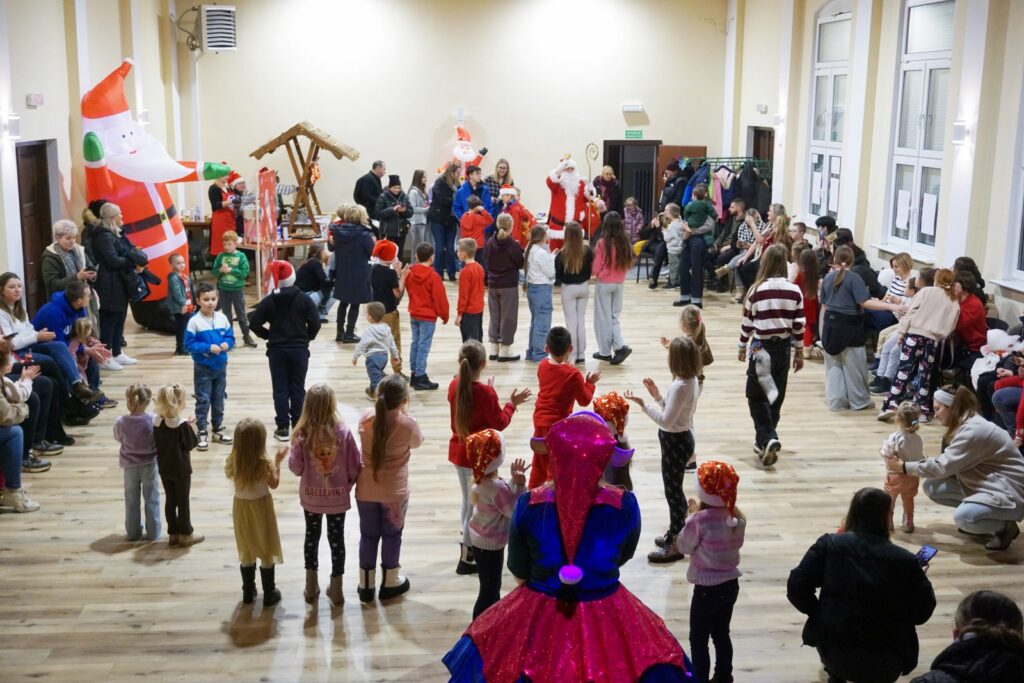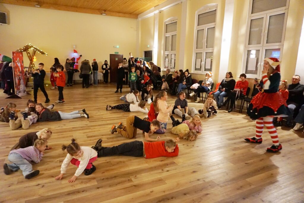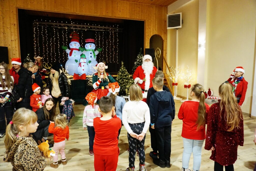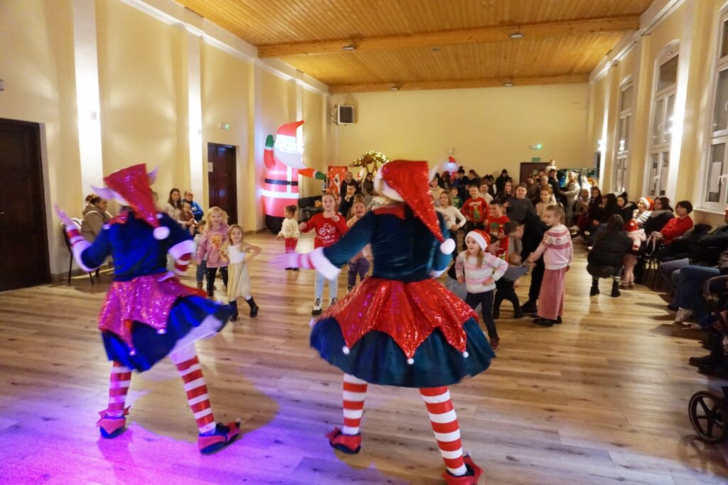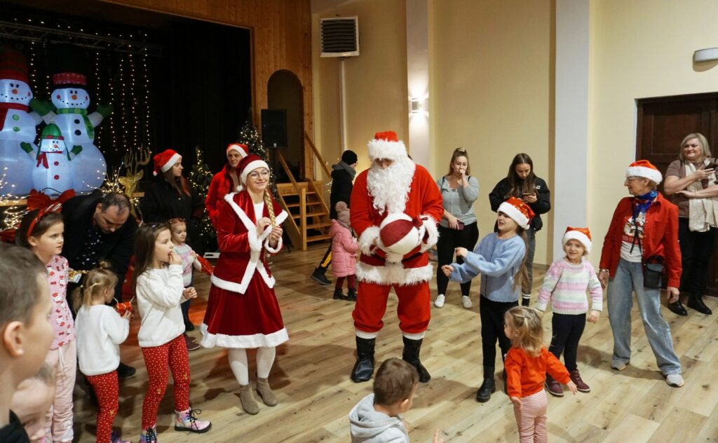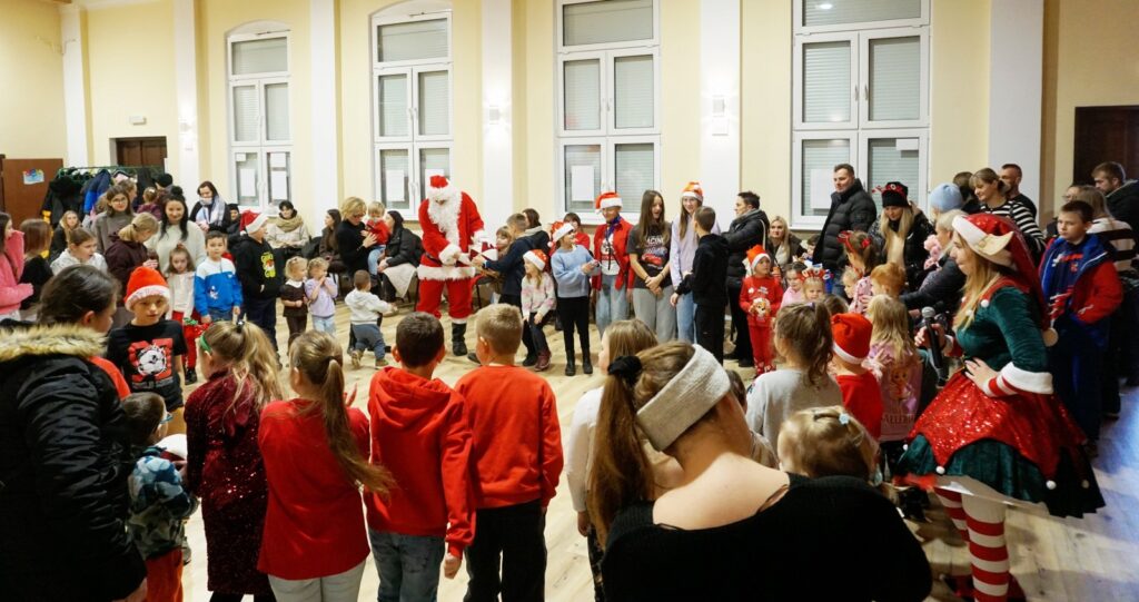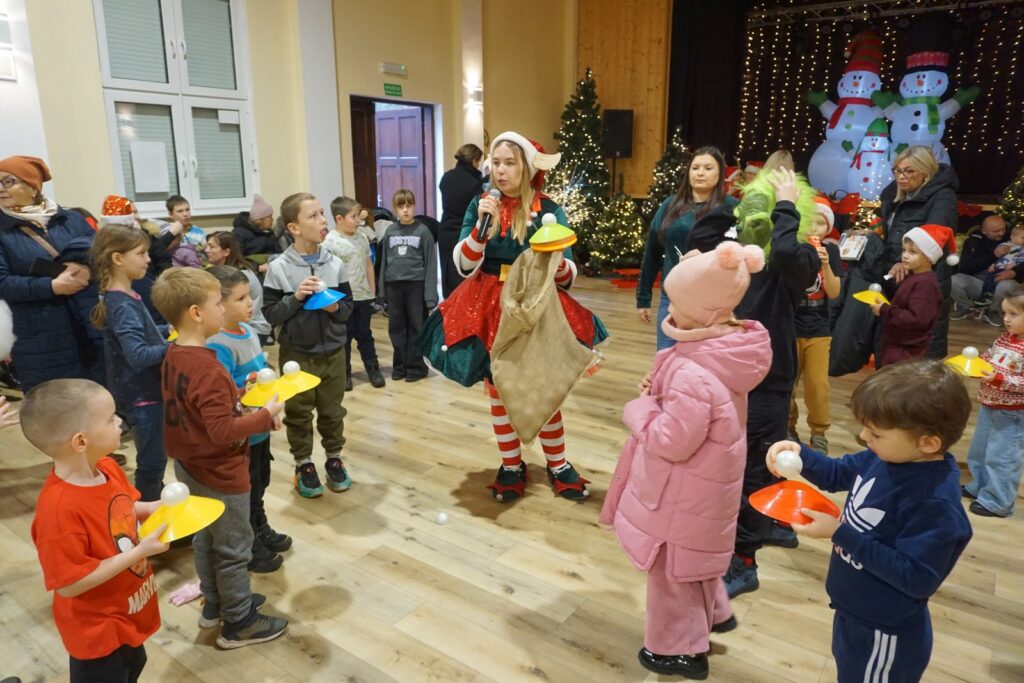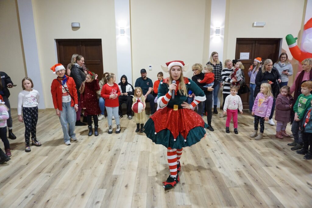Elementem dekoracyjnym były pięknie udekorowane choinki z migoczącymi iluminacjami, którym towarzyszyły świecące renifery. Dzieciaki mogły podziwiać olbrzymie dmuchańce: wesołą rodzinę bałwanów oraz imponującego, wielkiego Mikołaja. Uśmiechnięte Elfy z Malinowej Chatki poprowadziły animacje, angażując dzieci do wspólnych zabaw i tańców. Kulminacyjnym punktem programu było wejście Specjalnego Gościa i zabawy ze Świętym Mikołajem, który w wolnej chwili chętnie pozował do zdjęć. Słodkie przysmaki zaspokajały apetyty małych gości. Na stołach czekały liczne słodycze, w tym różnorodne ciastka, cukierki i soczki… W budynku pachniało watą cukrową i bąbelkowymi goframi. Serwowały je niezawodne członkinie Koła Gospodyń Wiejskich „Jezioranki”. Był to ich dar serca. Dzieci nie wychodziły z sali z pustymi rękami! Uczestnicy otrzymywali upominki rzeczowe z mikołajowych worków, ufundowane przez Stowarzyszenie „Aktywni”, z dofinansowania ze Starostwa Powiatowego. Następnie zabawa przeniosła się na zewnątrz.