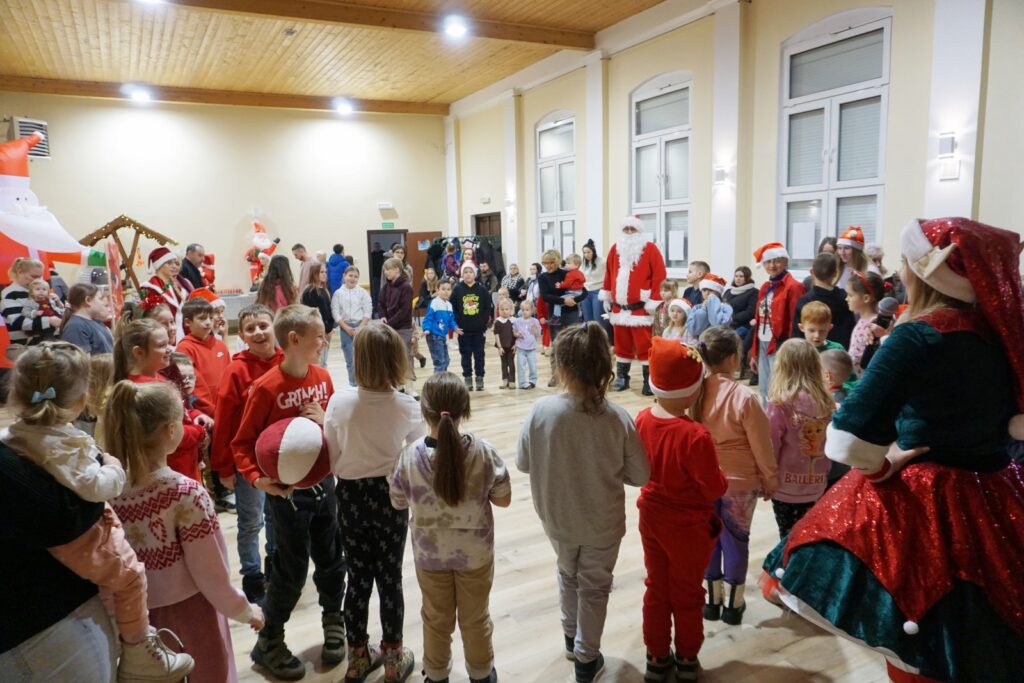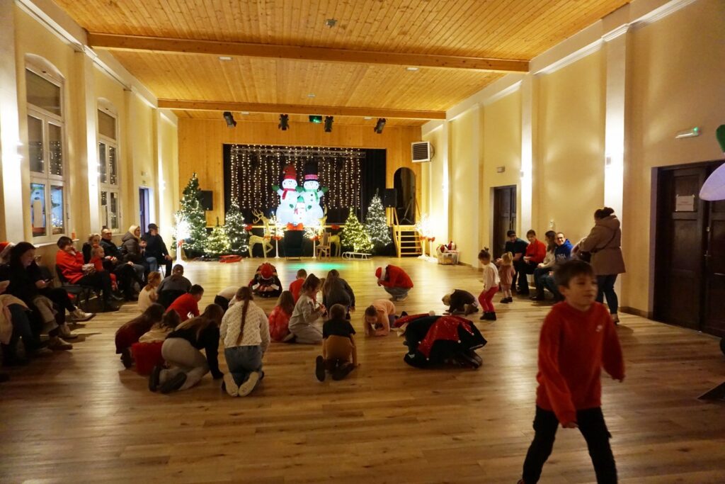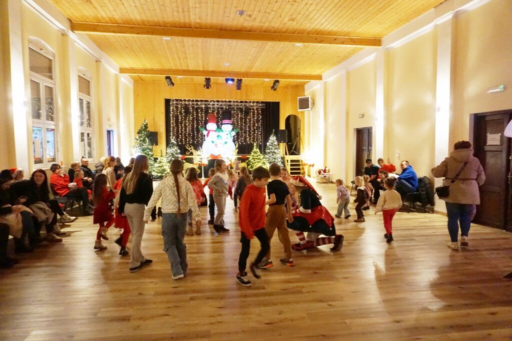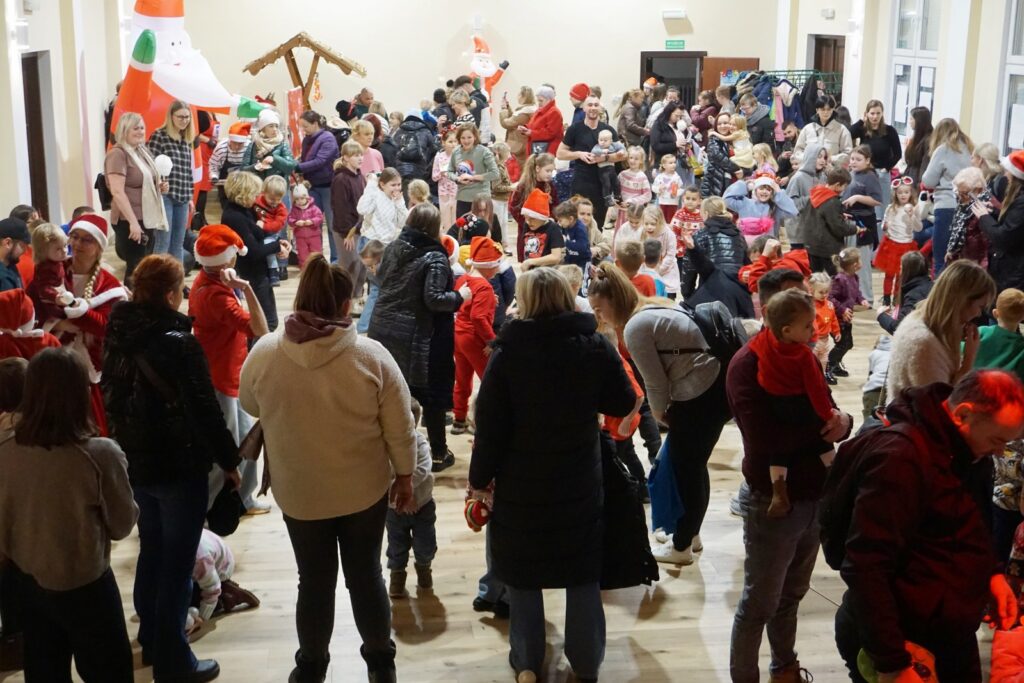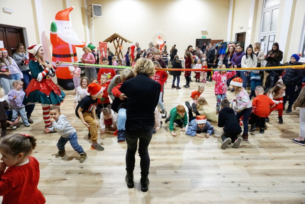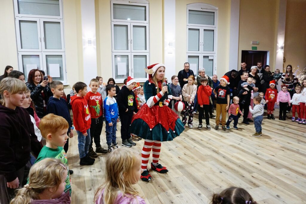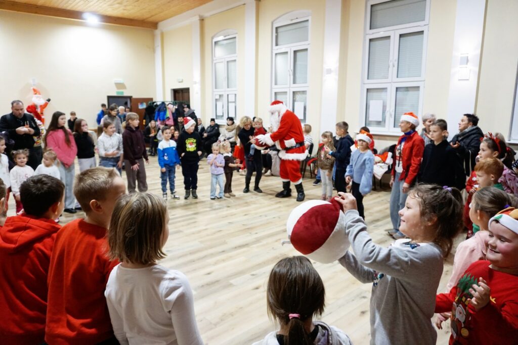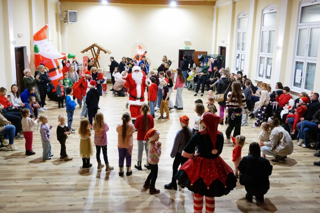 Elementem dekoracyjnym były pięknie udekorowane choinki z migoczącymi iluminacjami, którym towarzyszyły świecące renifery. Dzieciaki mogły podziwiać olbrzymie dmuchańce: wesołą rodzinę bałwanów oraz imponującego, wielkiego Mikołaja. Uśmiechnięte Elfy z Malinowej Chatki poprowadziły animacje, angażując dzieci do wspólnych zabaw i tańców. Kulminacyjnym punktem programu było wejście Specjalnego Gościa i zabawy ze Świętym Mikołajem, który w wolnej chwili chętnie pozował do zdjęć. Słodkie przysmaki zaspokajały apetyty małych gości. Na stołach czekały liczne słodycze, w tym różnorodne ciastka, cukierki i soczki… W budynku pachniało watą cukrową i bąbelkowymi goframi. Serwowały je niezawodne członkinie Koła Gospodyń Wiejskich „Jezioranki”. Był to ich dar serca. Dzieci nie wychodziły z sali z pustymi rękami! Uczestnicy otrzymywali upominki rzeczowe z mikołajowych worków, ufundowane przez Stowarzyszenie „Aktywni”, z dofinansowania ze Starostwa Powiatowego. Następnie zabawa przeniosła się na zewnątrz.