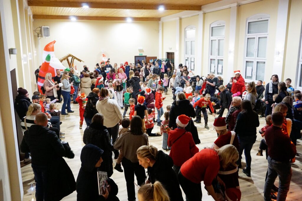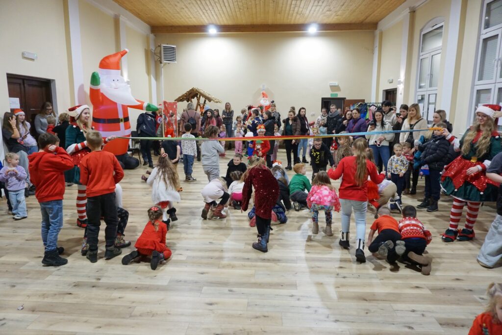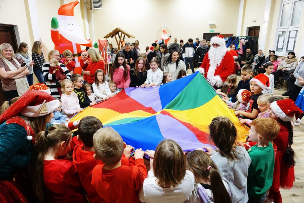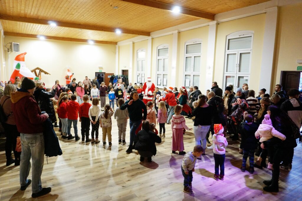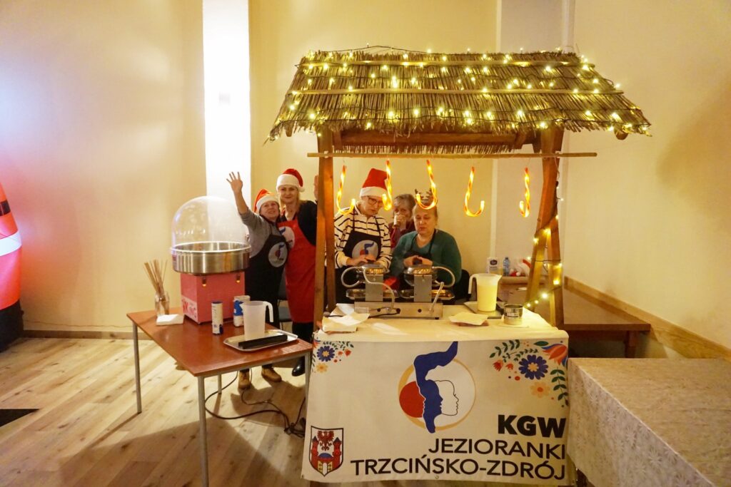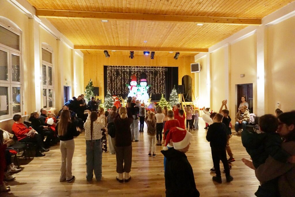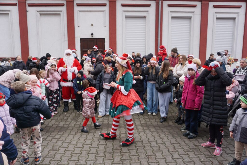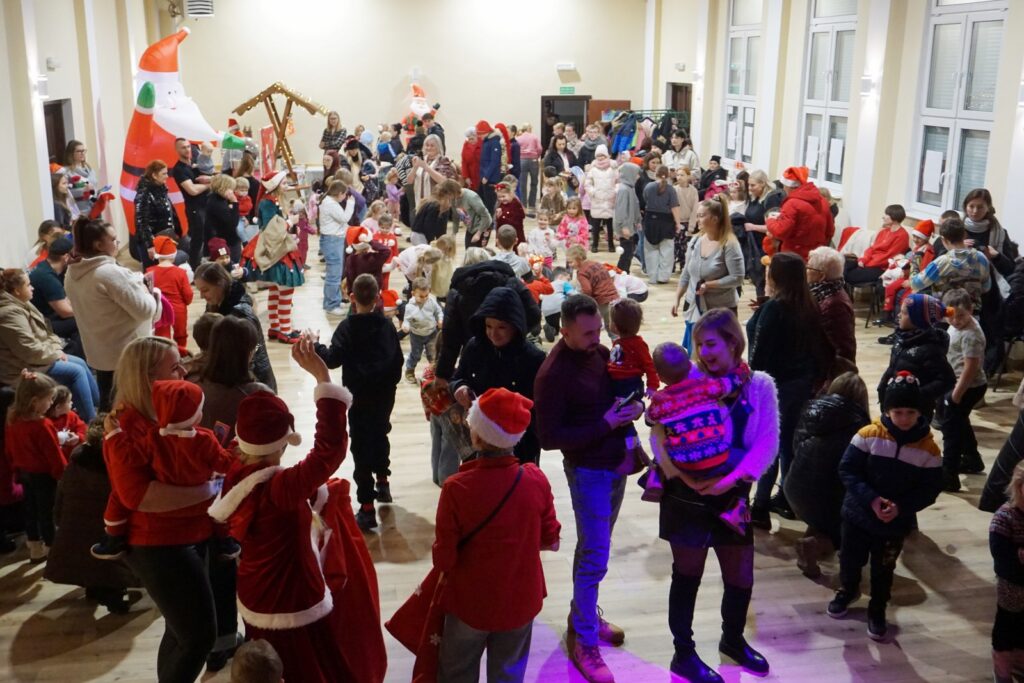 Elementem dekoracyjnym były pięknie udekorowane choinki z migoczącymi iluminacjami, którym towarzyszyły świecące renifery. Dzieciaki mogły podziwiać olbrzymie dmuchańce: wesołą rodzinę bałwanów oraz imponującego, wielkiego Mikołaja. Uśmiechnięte Elfy z Malinowej Chatki poprowadziły animacje, angażując dzieci do wspólnych zabaw i tańców. Kulminacyjnym punktem programu było wejście Specjalnego Gościa i zabawy ze Świętym Mikołajem, który w wolnej chwili chętnie pozował do zdjęć. Słodkie przysmaki zaspokajały apetyty małych gości. Na stołach czekały liczne słodycze, w tym różnorodne ciastka, cukierki i soczki… W budynku pachniało watą cukrową i bąbelkowymi goframi. Serwowały je niezawodne członkinie Koła Gospodyń Wiejskich „Jezioranki”. Był to ich dar serca. Dzieci nie wychodziły z sali z pustymi rękami! Uczestnicy otrzymywali upominki rzeczowe z mikołajowych worków, ufundowane przez Stowarzyszenie „Aktywni”, z dofinansowania ze Starostwa Powiatowego. Następnie zabawa przeniosła się na zewnątrz.