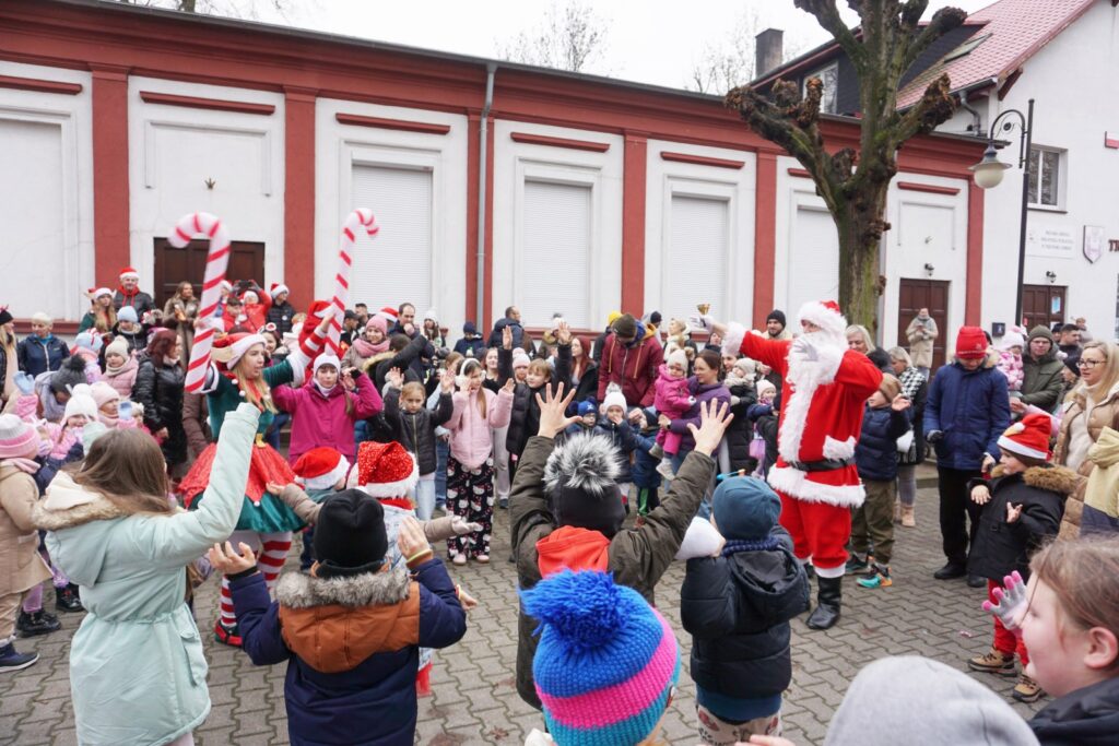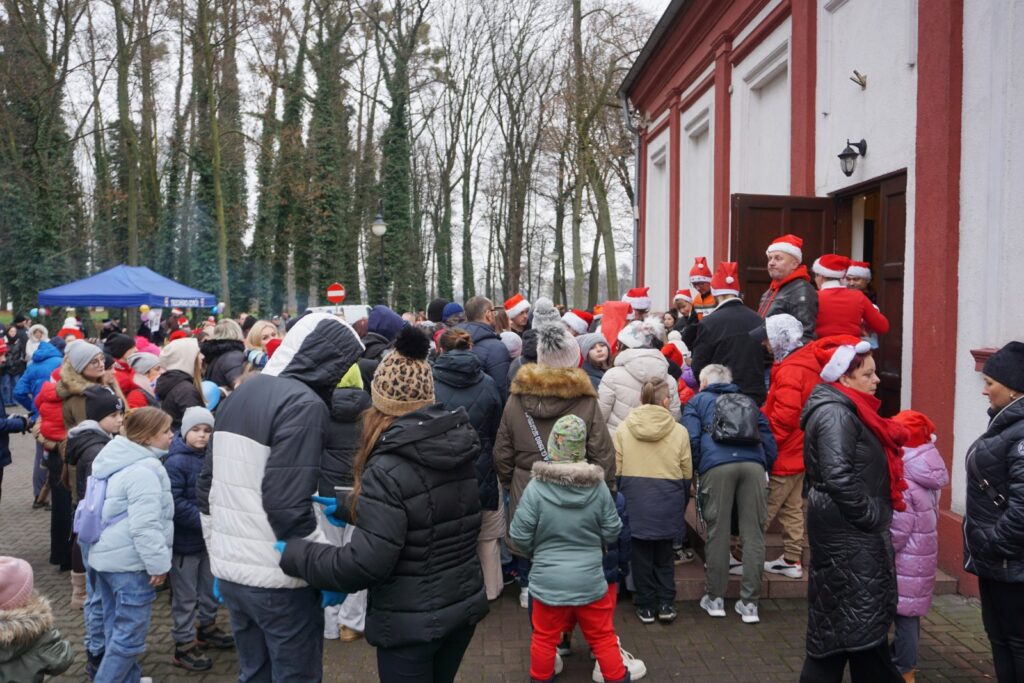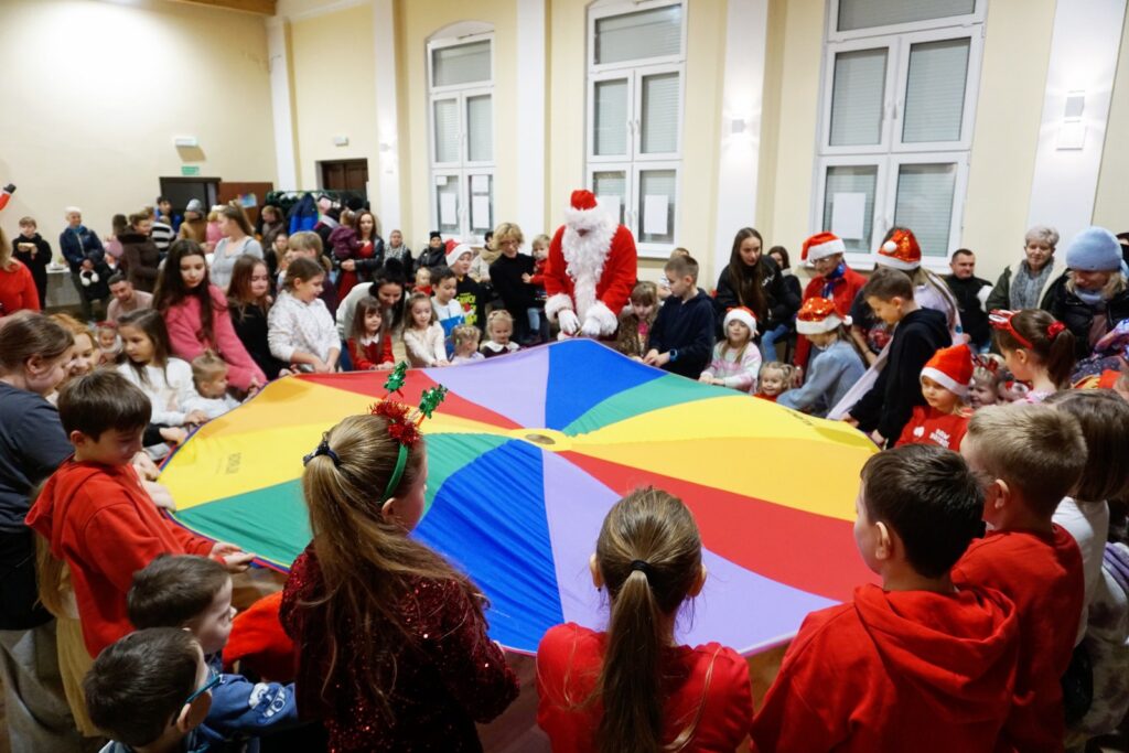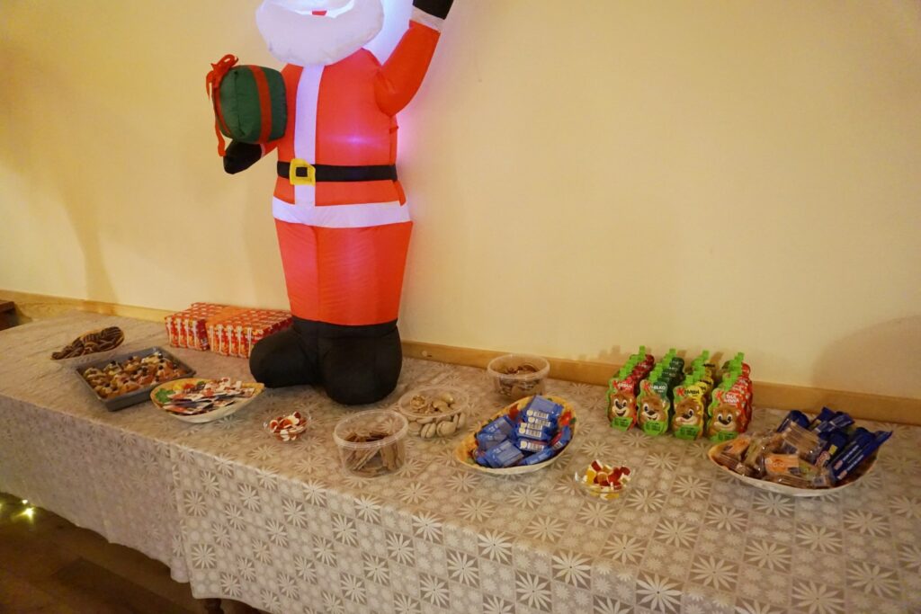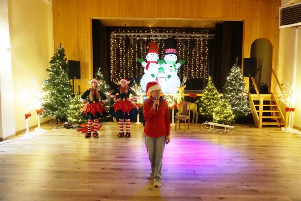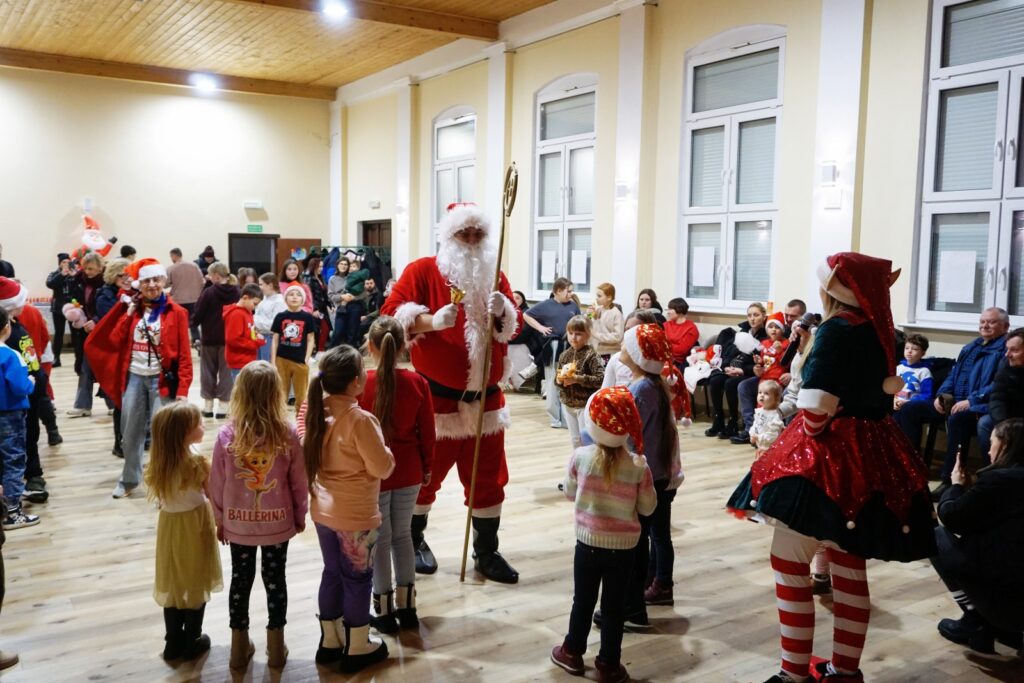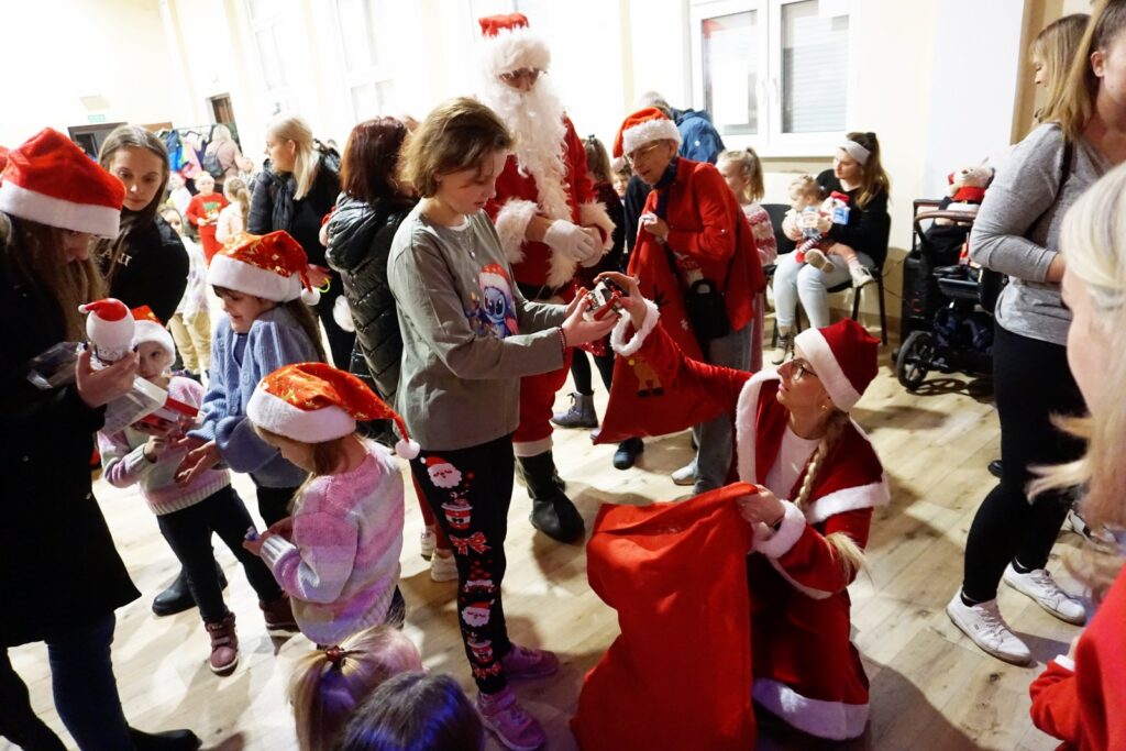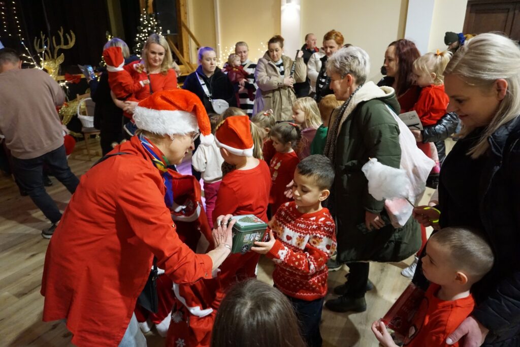 Elementem dekoracyjnym były pięknie udekorowane choinki z migoczącymi iluminacjami, którym towarzyszyły świecące renifery. Dzieciaki mogły podziwiać olbrzymie dmuchańce: wesołą rodzinę bałwanów oraz imponującego, wielkiego Mikołaja. Uśmiechnięte Elfy z Malinowej Chatki poprowadziły animacje, angażując dzieci do wspólnych zabaw i tańców. Kulminacyjnym punktem programu było wejście Specjalnego Gościa i zabawy ze Świętym Mikołajem, który w wolnej chwili chętnie pozował do zdjęć. Słodkie przysmaki zaspokajały apetyty małych gości. Na stołach czekały liczne słodycze, w tym różnorodne ciastka, cukierki i soczki… W budynku pachniało watą cukrową i bąbelkowymi goframi. Serwowały je niezawodne członkinie Koła Gospodyń Wiejskich „Jezioranki”. Był to ich dar serca. Dzieci nie wychodziły z sali z pustymi rękami! Uczestnicy otrzymywali upominki rzeczowe z mikołajowych worków, ufundowane przez Stowarzyszenie „Aktywni”, z dofinansowania ze Starostwa Powiatowego. Następnie zabawa przeniosła się na zewnątrz.