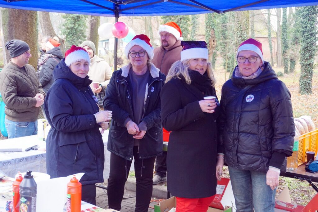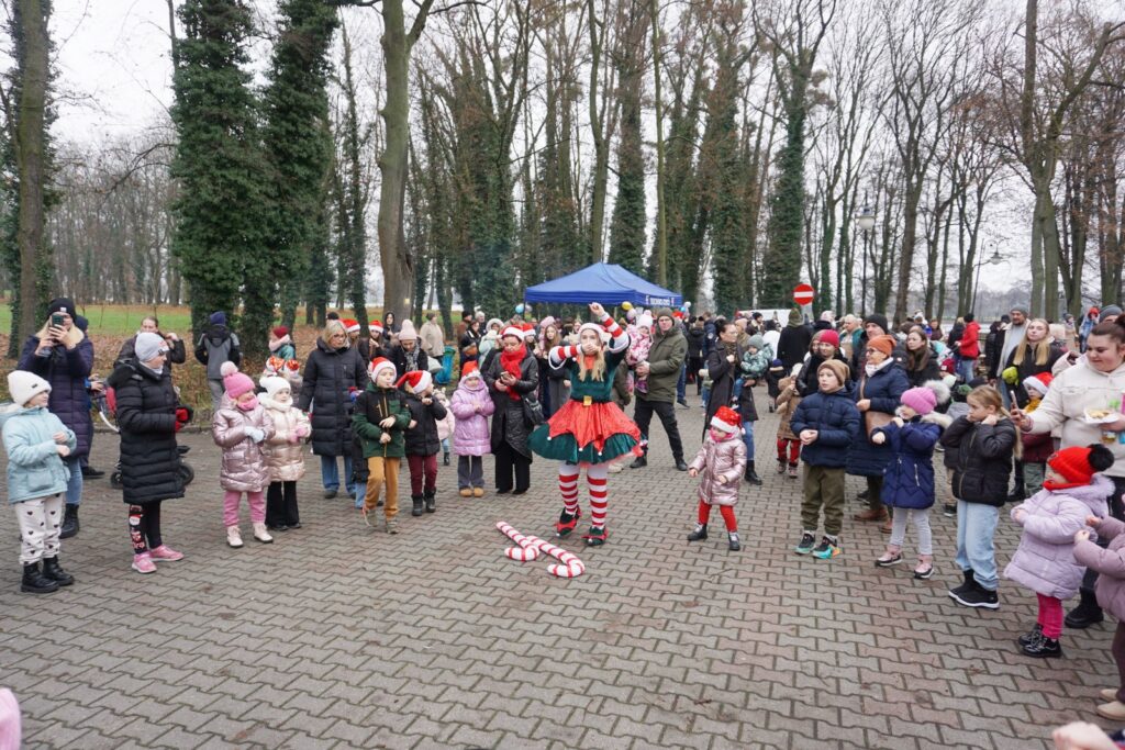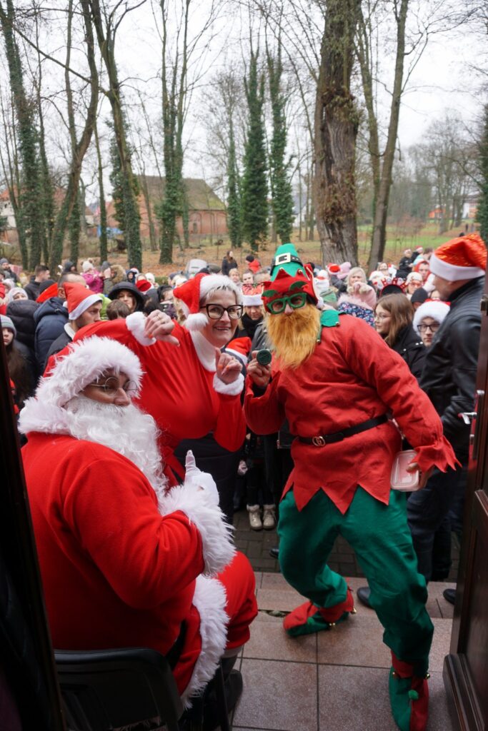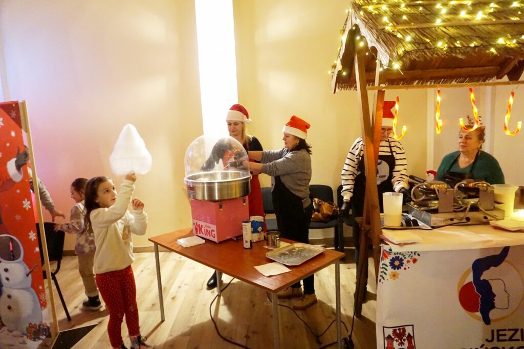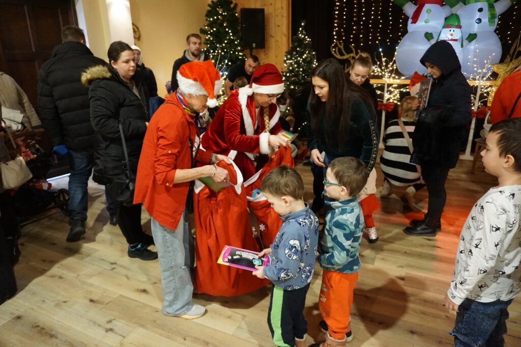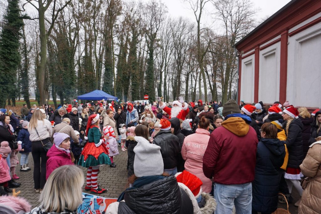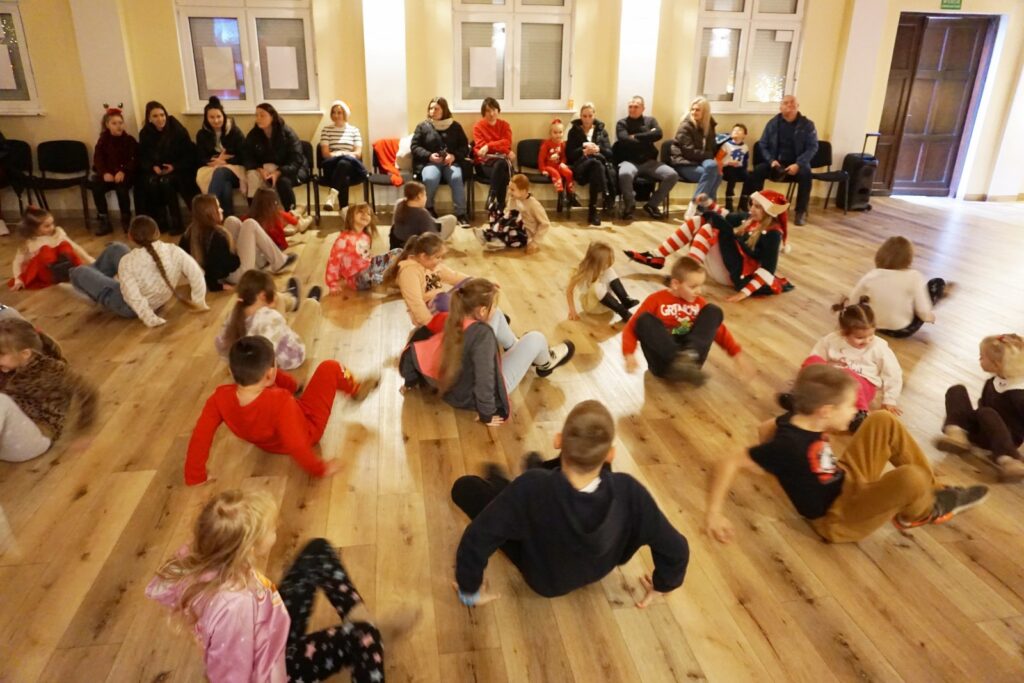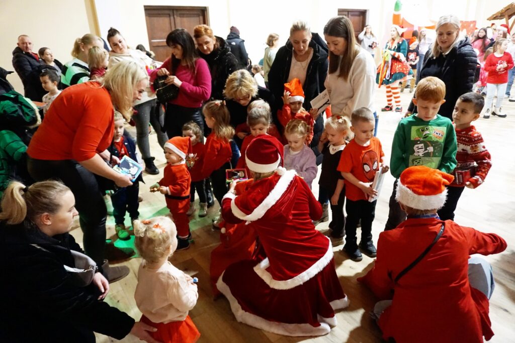Elementem dekoracyjnym były pięknie udekorowane choinki z migoczącymi iluminacjami, którym towarzyszyły świecące renifery. Dzieciaki mogły podziwiać olbrzymie dmuchańce: wesołą rodzinę bałwanów oraz imponującego, wielkiego Mikołaja. Uśmiechnięte Elfy z Malinowej Chatki poprowadziły animacje, angażując dzieci do wspólnych zabaw i tańców. Kulminacyjnym punktem programu było wejście Specjalnego Gościa i zabawy ze Świętym Mikołajem, który w wolnej chwili chętnie pozował do zdjęć. Słodkie przysmaki zaspokajały apetyty małych gości. Na stołach czekały liczne słodycze, w tym różnorodne ciastka, cukierki i soczki… W budynku pachniało watą cukrową i bąbelkowymi goframi. Serwowały je niezawodne członkinie Koła Gospodyń Wiejskich „Jezioranki”. Był to ich dar serca. Dzieci nie wychodziły z sali z pustymi rękami! Uczestnicy otrzymywali upominki rzeczowe z mikołajowych worków, ufundowane przez Stowarzyszenie „Aktywni”, z dofinansowania ze Starostwa Powiatowego. Następnie zabawa przeniosła się na zewnątrz.