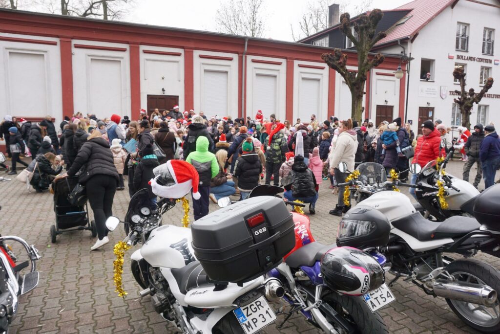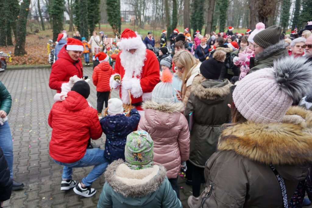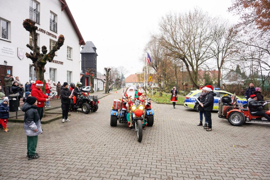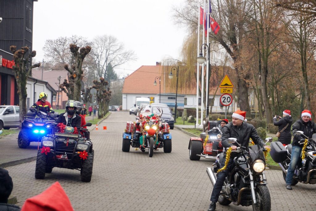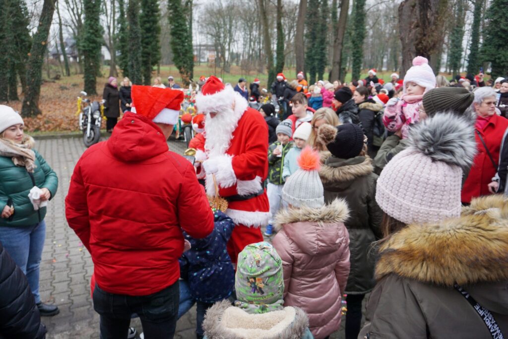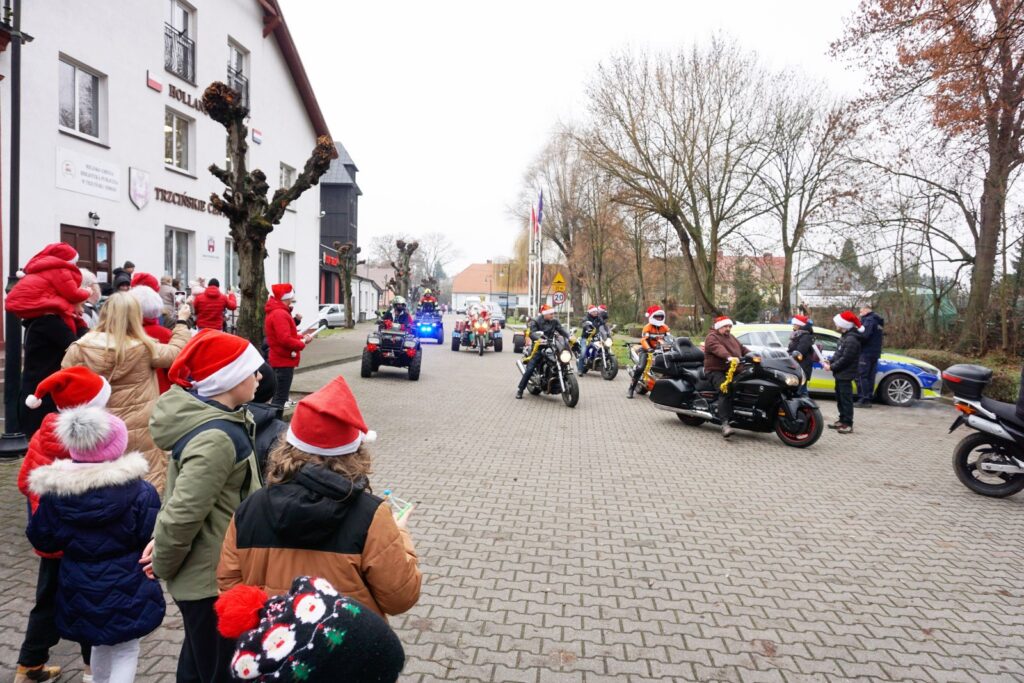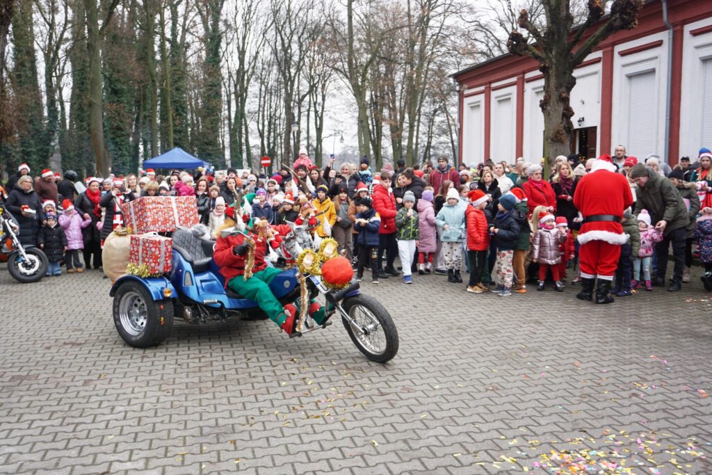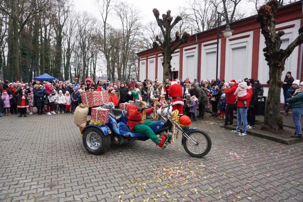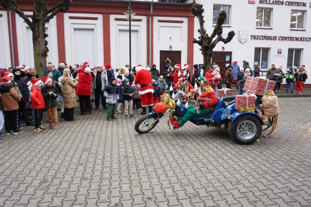 Przed budynkiem BiCK, atmosfera stawała się gorąca, mimo grudniowej aury. Dzięki Grupie Motocyklowej Trzcińsko-Zdrój wydarzenie rozpoczęło się od prawdziwie spektakularnego akcentu! Grupa Moto Mikołajów w świątecznych czapeczkach, eskortowana przez radiowóz policyjny oraz quady OSP, uroczyście wprowadzili Mikołaja. Sam Święty Mikołaj zjechał do wiwatującego tłumu na trajce, prowadzonej przez rudego Elfa, co wywołało zachwyt i okrzyki radości. Zabawa z elfami i Mikołajem rozpoczęła się na nowo. Były śmiechy i tańce-połamańce. Dobra pogoda sprzyjała zabawie na zewnątrz. Dodatkową atrakcją było pieczenie kiełbasek oraz serwowana gorąca kawa i herbata, które umilały oczekiwanie.