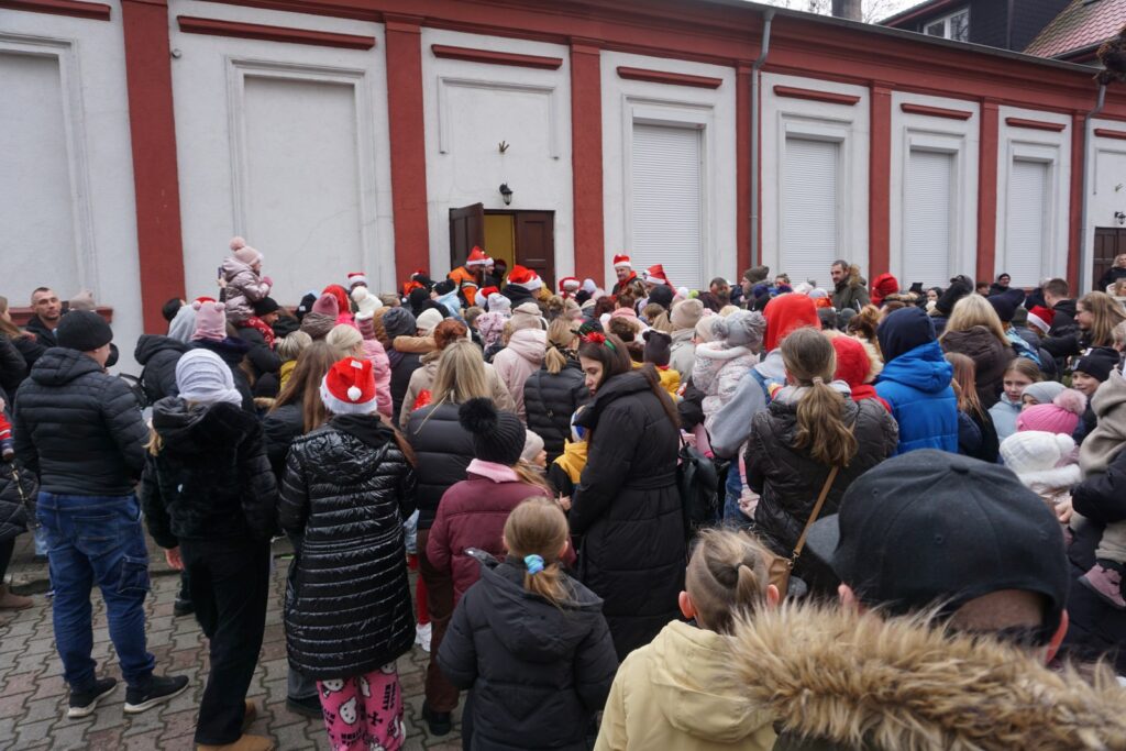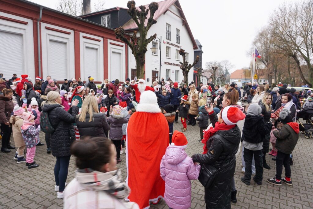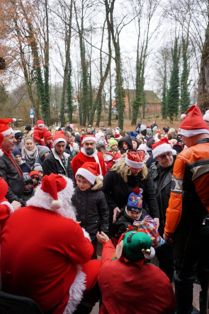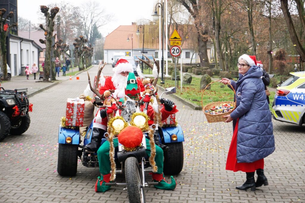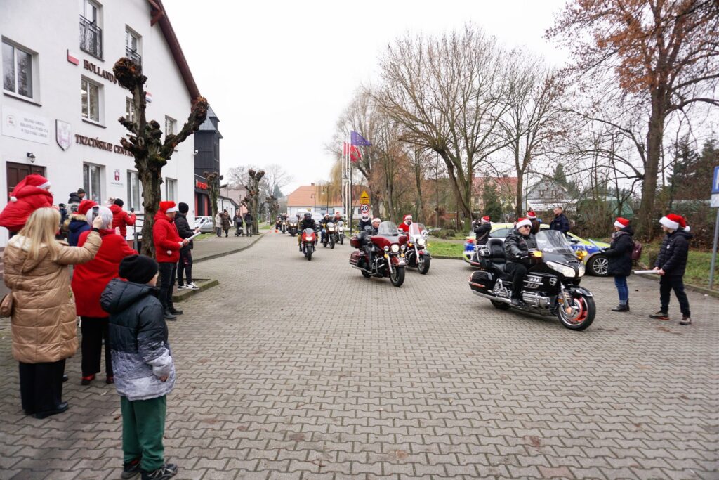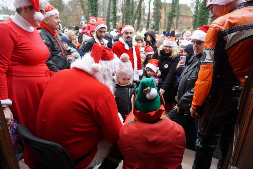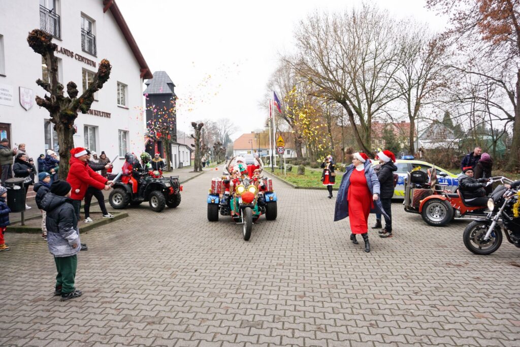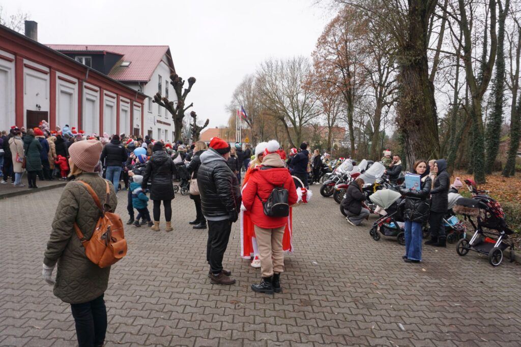 Przed budynkiem BiCK, atmosfera stawała się gorąca, mimo grudniowej aury. Dzięki Grupie Motocyklowej Trzcińsko-Zdrój wydarzenie rozpoczęło się od prawdziwie spektakularnego akcentu! Grupa Moto Mikołajów w świątecznych czapeczkach, eskortowana przez radiowóz policyjny oraz quady OSP, uroczyście wprowadzili Mikołaja. Sam Święty Mikołaj zjechał do wiwatującego tłumu na trajce, prowadzonej przez rudego Elfa, co wywołało zachwyt i okrzyki radości. Zabawa z elfami i Mikołajem rozpoczęła się na nowo. Były śmiechy i tańce-połamańce. Dobra pogoda sprzyjała zabawie na zewnątrz. Dodatkową atrakcją było pieczenie kiełbasek oraz serwowana gorąca kawa i herbata, które umilały oczekiwanie.